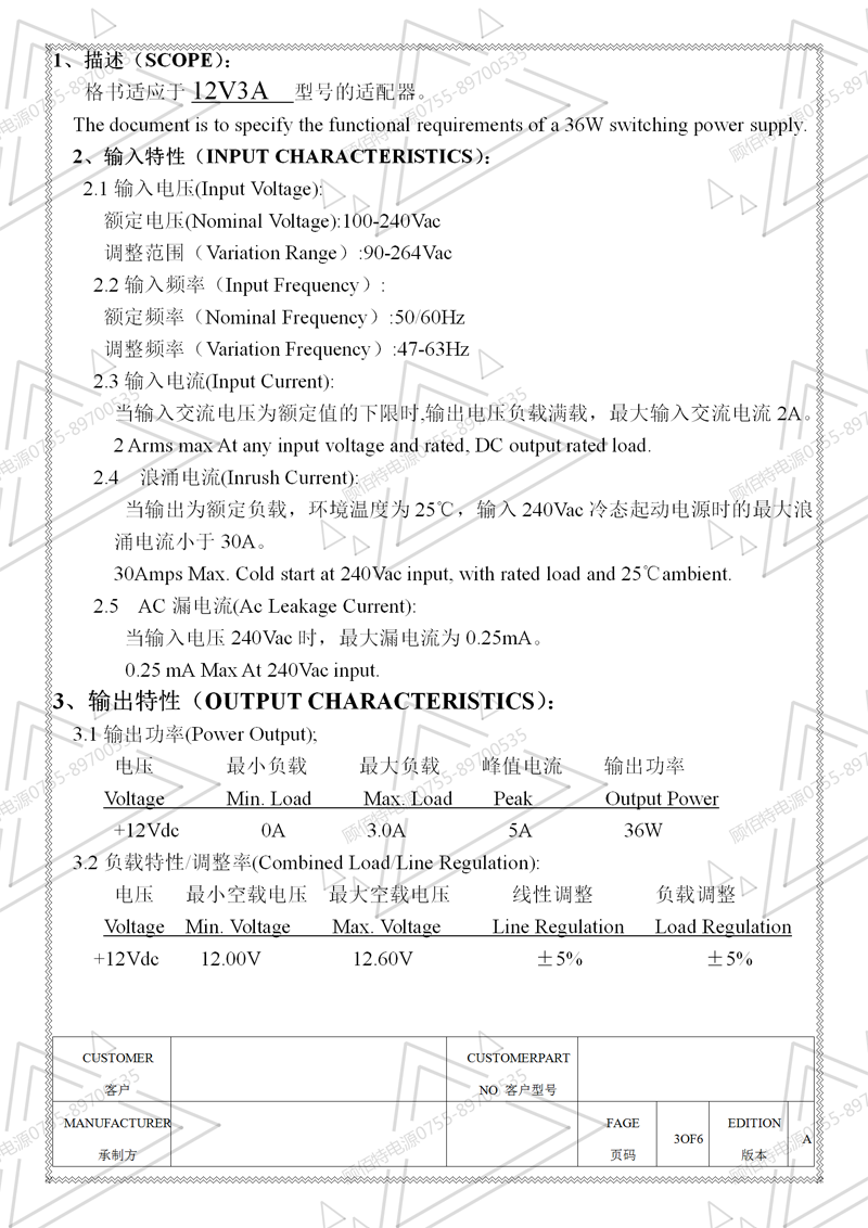 12V3A電源適配器規(guī)格書
