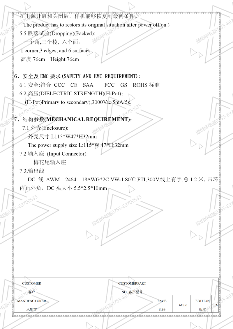 19V3.5A電源適配器規(guī)格書